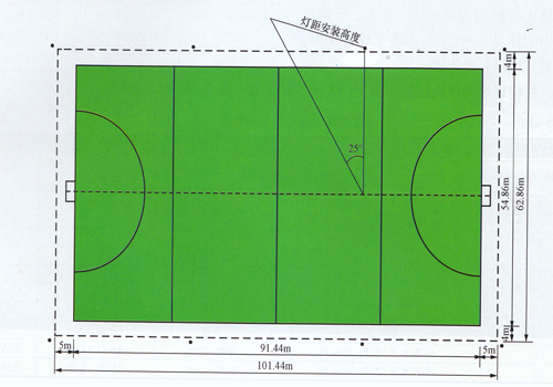 曲棍球場(chǎng)地四周設(shè)有無(wú)障礙區(qū),在障礙區(qū)域內(nèi)絕對(duì)不允許裝設(shè)燈桿,燈塔。無(wú)障礙區(qū)域最小為:距兩底線5m,距兩邊線4m。