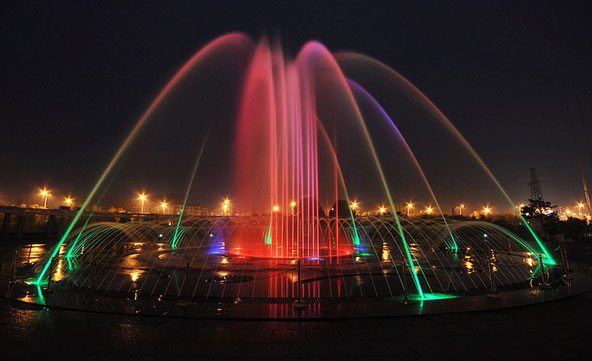 噴泉是富于動態(tài),集聲、光、色、形于一體的設施。其中,光與色是同步產(chǎn)生和消失的,色必須通過光束才能表現(xiàn)出來。因此,應將色與光同時考慮,統(tǒng)一安排。
