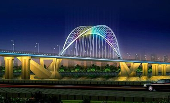 現代的大橋,多系現代化的鋼索斜拉橋,有雙塔斜拉、單塔斜拉。斜拉橋的外形特色在于拉索。大橋的照明將以重點突出這一特色為主,用不同的燈具及匠心獨具的藝術手法,一架碩大的豎琴屹立在大江、大河之上。為了烘托大橋的節目氣氛的整體效果,在橋上兩旁沿馬路,每4-5米可以放置1個藝術燈具,使之鏈成一條閃光的珍珠項鏈。對主塔的立面泛光照明可分三個方面:由下面上投時,要把整個主塔照得晶瑩透徹、潔白無瑕,雄偉壯觀這是大橋景觀的重中之重。為了使主塔全部都照亮,透視效果好,應該還要在路面下設置平臺。用泛光燈由上向下照亮水面上部的塔基部分,使高塔的照明效果宛如一個巨人屹立在河水之上。